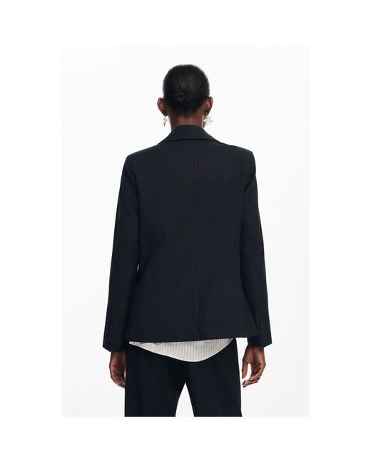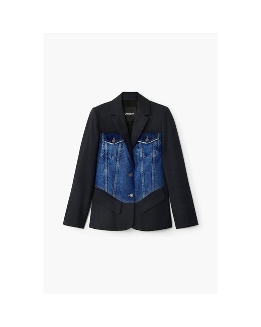 Hybrid blazer in plain fabric with a trucker-style denim jacket front, lapel collar, and shoulder pads. This product is sourced through a mass balance system and may not contain Better Cotton. Product Details.