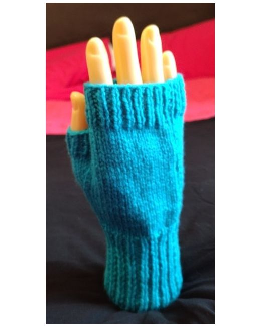 Hand-knitted pair of medium fingerless gloves in blue acrylic yarn. There's one hole for all four fingers. Thicker and longer wearing than machine knitted gloves.