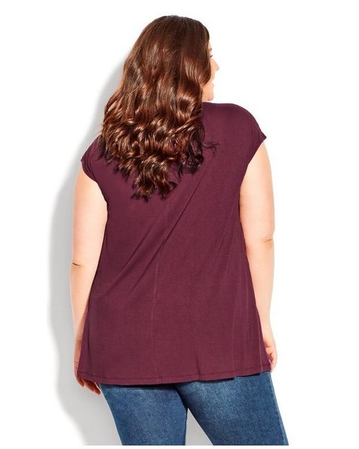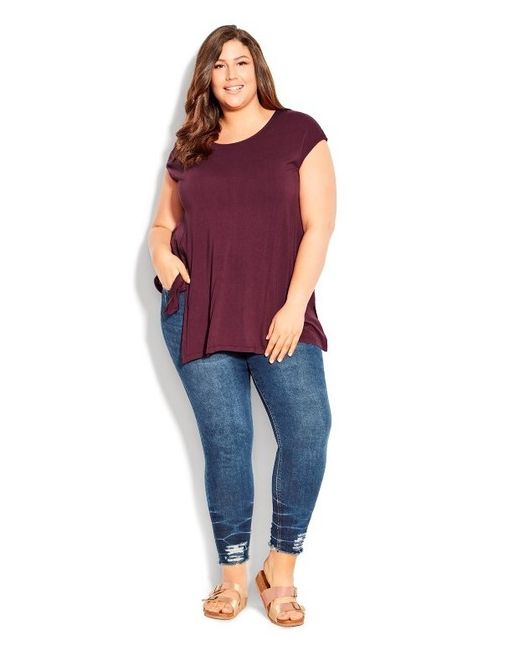 Embrace your curves in the plum Split Side Plain Top. - Hip length hemline with split sides. Model wears an Avenue size 18-20. - Short cap sleeves. 95% Viscose, 5% Elastane. Fabric has stretch. Key Features Include.