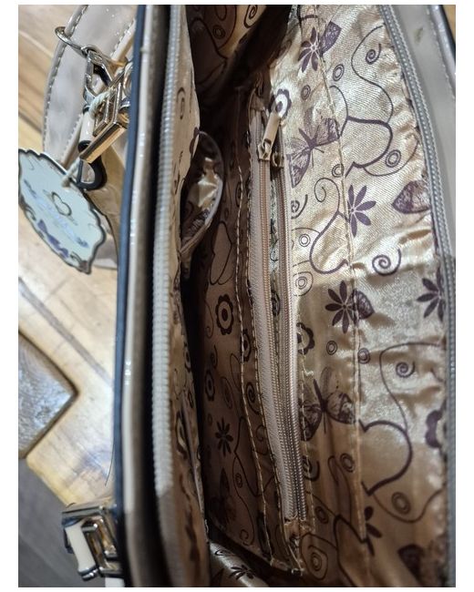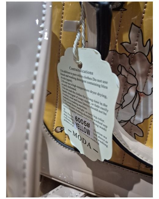 Moda handbag new with tag. Yellow and beige. Shoulder handles removable with smaller handles. Inside material as a silky feel flower and butterfly's. Not got the protective bag to cover it. Width bag 14 inches 35.56 cm. Depth 10 inch 26 cm. Yellow pattern with beige handles and bottom of bag. Shiny patent. inside is two zipped pockets and then two other. Four pockets in total. Two pockets not with a zip. Top of bag is a zip. Comes from a smoke and pet free home.