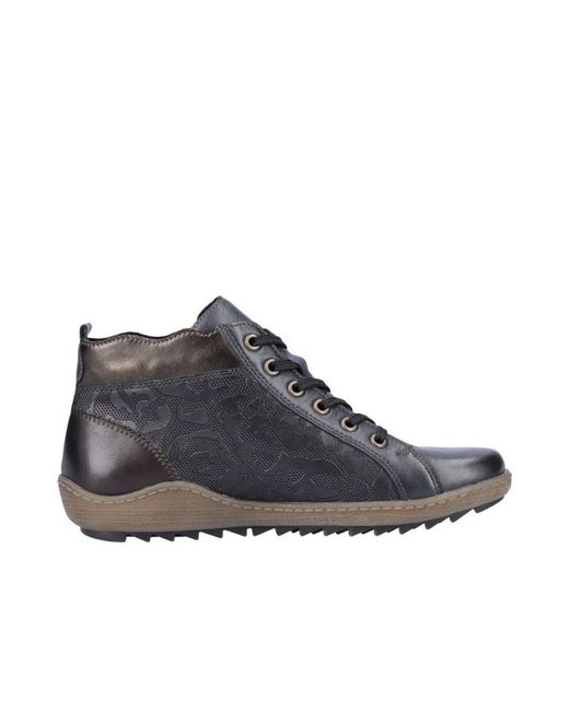 Remonte R1467 is a hi-top ankle boot that would look great with trouser styles in particular and boasts plenty of character as well as that all important water-resistant Remonte-Tex. R1467 -14 is navy and brown. Decorative printed patterned panels embellish R1467’s sides and contrasting metallized cuffs top the shaft.