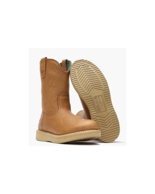 These Georgia Boot Wedge wellington work boots are highly durable and perfect for the farm and ranch or jobs where you boots are near harsh chemicals. Part of this can be attributed to the Spr full-grain leather which is able to resist caustic chemicals and barnyard acids. Compared to traditional leather, Spr leather has 3 times the strength and is able to resist abrasions 2 ½ times better because of the way it has been tanned. On top of being made with great leather, these men's work boots have Goodyear welt construction. By building the footwear this way it gives them durability and strength plus it allows you to have the outsole replaced if it ever becomes worn down. To help you get these 10-inch wellington boots on easily, there are pull loops on each side of the boot. Inside is a soft lining and a cushion insole, both of help make these comfortable work boots. A steel shank supports the arch of your foot and enables you to have steady footing throughout the day.
