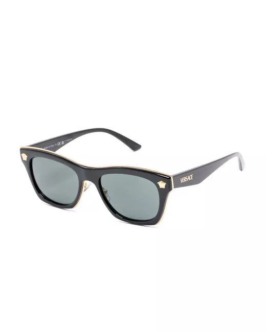 black/gold-tone high-shine finish wayfarer frame tinted lenses UV-protective lenses metallic detailing Medusa Head motif logo plaque at the arm straight arms curved tips These glasses come with a protective case.