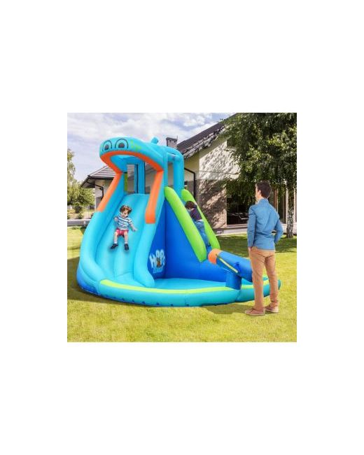 Turn your backyard into a water wonderland with this hippo-themed inflatable water bouncer! Featuring a curved slide, climbing wall, splash pool, and water cannon, it offers endless fun for kids aged 3-10. Made from durable materials with safety features, it inflates quickly and includes practical accessories for easy use and storage.