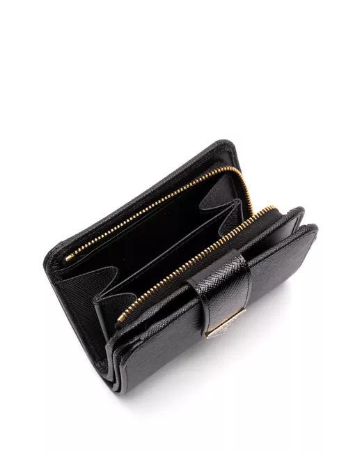 black calf leather smooth grain enamel triangle logo bi-fold design strap and press-stud fastening zip-fastening pocket internal card slots internal note compartments