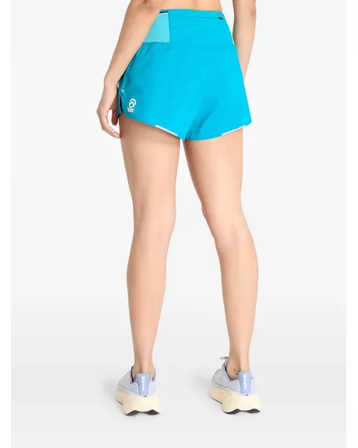 cerulean blue elasticated waistband slip pockets to the sides rear zip-fastening pocket logo print at the leg