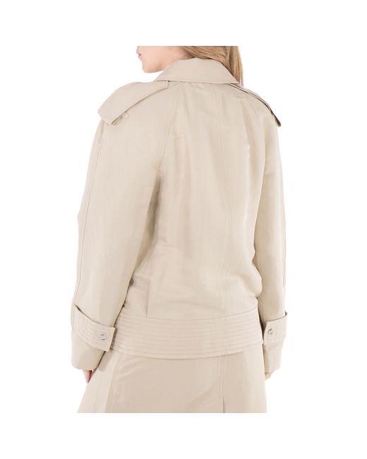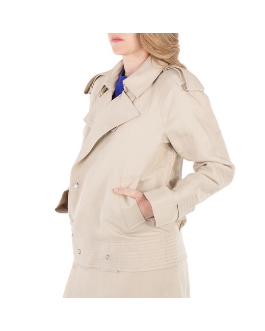 Burberry Ladies Outerwear. Fashion category: Coats & Jackets. SKU: 8087349. Material: Viscose. Color: Oat. Burberry Double-Breasted Canvas Trench Jacket. This jacket features a canvas material, shoulder boards, wide falling lapels, an asymmetrical button closure at the front, deep shoulders, long sleeves with straps, two side pockets, and a straight hem. Outer: 68% paper fibre, 32% viscose, Lining: 100% viscose. Made in Poland.