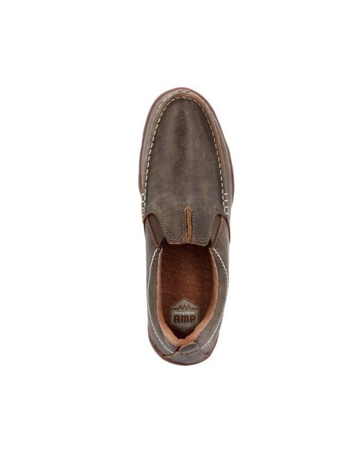 The Georgia Boot Cedar Falls moc-toe slip on shoe is designed for supreme comfort. The upper on this men s casual shoe is made of full-grain distressed leather and features twin gore panels for an easy slide on. The interior is lined in a moisture-wicking material and has a removable memory foam insole that cradles your foot in all day comfort. The unique tread pattern resembles a park map and rounds out the rugged casual look on this shoe..