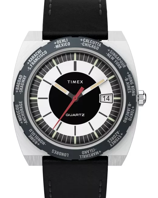 39mm black stainless steel round face baton hands date indication world time zones screw-down crown pin-buckle fastening quartz movement water resistance up to 50m/5 ATM