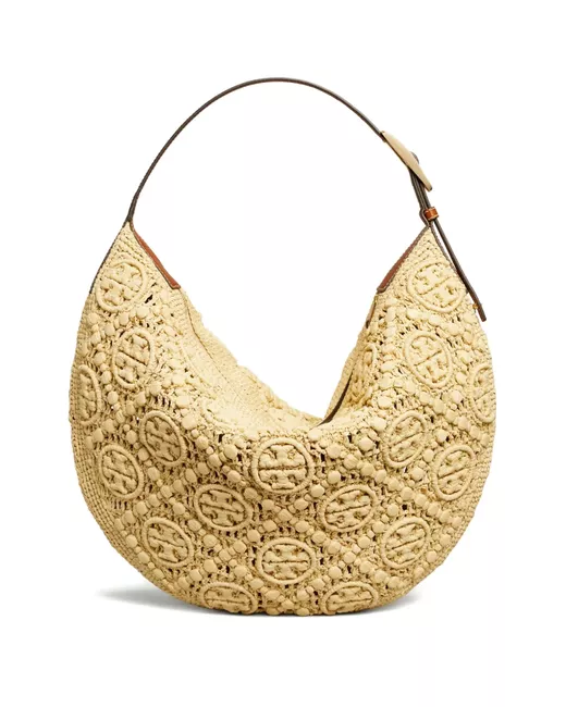 beige intricate crochet design leather shoulder strap logo detailing spacious interior