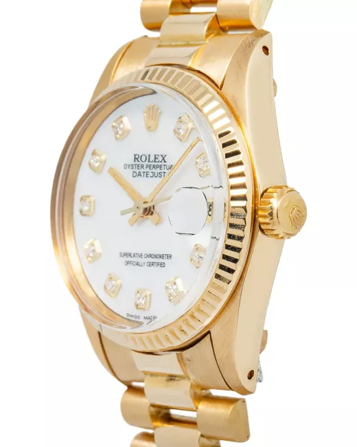 pre-owned 26mm yellow gold round face fluted bezel signature Crown appliqué diamond index central hours, minutes and seconds signature Cyclops lens automatic movement screw-down crown signature President bracelet deployant-clasp fastening This item comes with a standard one-year warranty from the boutique. Condition: EXCELLENT. This previously owned item is in near-perfect condition with no signs of damage or use.