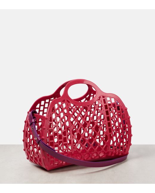 Material: polyurethane. Lining: unlined. Made in Italy. Designer color name: Fuchsia Rose. Item color: pink. Internal details: single compartment. Top handles, Detachable shoulder strap. Closure: open top.