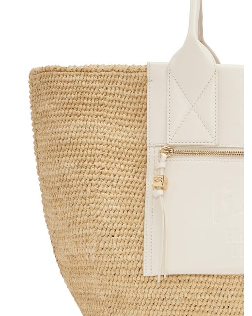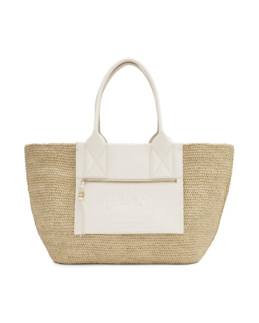 Ganni's Easy Shopper Medium bag features a flexible raffia construction elevated by leather trimming. This piece was designed with top handles and an exterior zip pocket for easy stowaway. Top handles Exterior zip pocket Open top Raffia Imported SIZE About, 21"W x 11"H x 7"D. Handbags - Collection Handbags > Ganni > Saks Fifth Avenue > Barneys. Ganni. Color: Egret.
