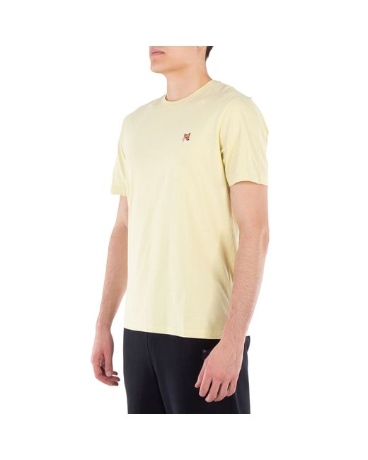 Maison Kitsune Mens Tops. Fashion category: T-Shirts & Henleys. SKU: LM00104KJ0008-CHALK YELL. Color: Yellow. Maison Kitsune Fox Head Patch T-Shirt. A classic jersey t-shirt featuring a regular fit, short sleeves, a rib-knit crewneck, reinforced seams at the sleeves and waist, and an embroidered Fox Head patch on the chest. 100% Cotton.