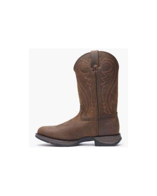 The exterior of this men's 12" pull-on boot has a lot to offer. The round toe curves nicely and will be comfortable for your toes. The full-grain leather is extremely durable and the deep Chocolate hue adds to the ruggedness of this Western boot. The decorative stitching on the shaft is very traditional, but adds visual interest. Welt stitching goes around the boot, in double rows, which keeps the boot's construction hardy. Internally, the contoured footbed will cushion your steps and its ventilation will keep your feet feeling dry and comfortable. You will be amazed at how such a small feature can have such a big impact and make your feet feel at ease. To help give you steady footing, this Rebel by Durango boot has a lower 1 3/8" Rebel heel, as well as a tempered steel shank. The outsole is made of two densities, rubber and Eva, so you will receive grip and cushioning as you are walking. These Rebel by Durango boots have a masculine look, are comfortable, and are made to last. . .