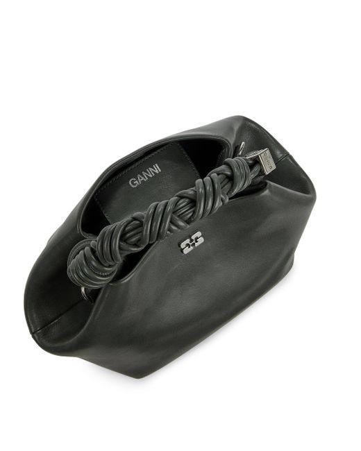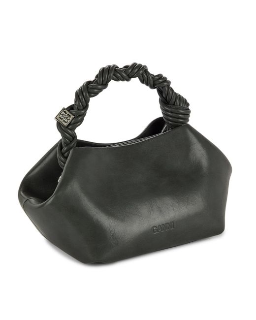 This Small Bou Bag from Ganni features a metallic Butterfly logo, a twisted handle with a braided knot and a metallic dice detail. The bag has an internal magnetic closure, a flat card pocket, and an adjustable and removable shoulder strap for crossbody wear. Top handle, detachable shoulder strap Magnetic snap closure Interior card pocket 60% leather/26% lyocell/14% polyurethane Imported SIZE & FIT About 11"W x 5.5"H x 6.7"D Strap length: about 19.75". Handbags - Collection Handbags > Ganni > Saks Fifth Avenue > Barneys. Ganni. Color: Steal Grey.