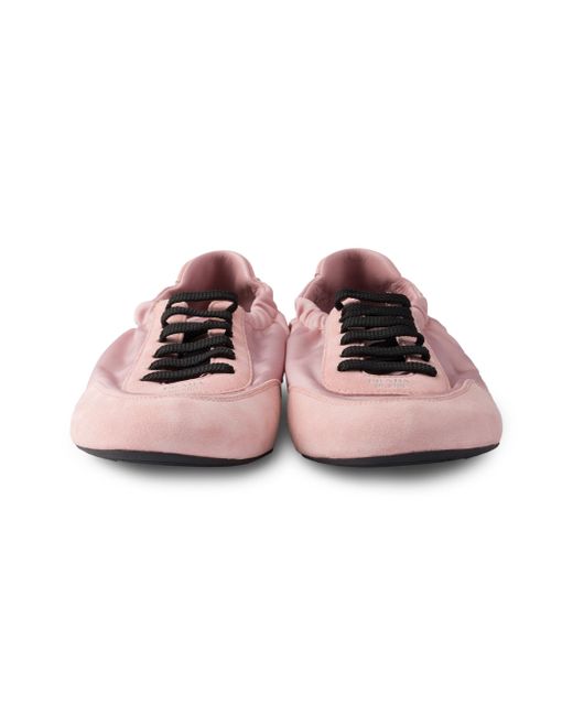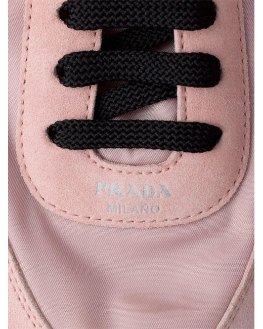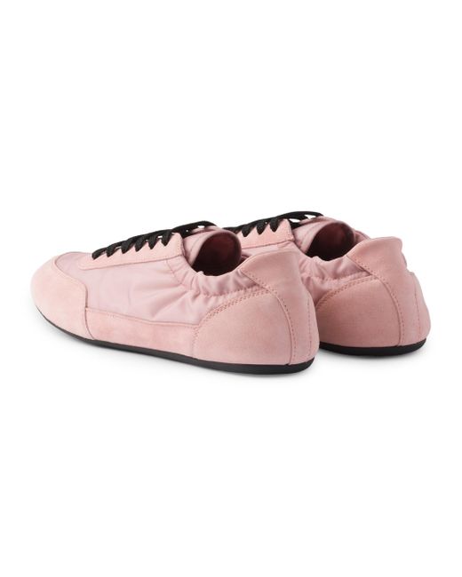 This incredibly lightweight sneaker with a structured design made of Re-Nylon and suede features a mix of materials that embodies Prada's sporty and artisanal soul. Its flat sole recalls the classic ballerina, enriched with elastic on the sides that makes it easy to slip on. Leather lining Screen-printed logo Cotton laces Rubber sole, 5 mm / 0.1'' Tread with a geometric pattern Removable leather-covered insole These shoes have undergone an artisan treatment, giving the leather a deliberate vintage look 67% Nylon, 33% Polyester - 100% Calf Leather Imported. Lsd Rtw - Prada Rtw > Prada > Saks Fifth Avenue > Barneys. Prada. Color: Pink. Size: 7.