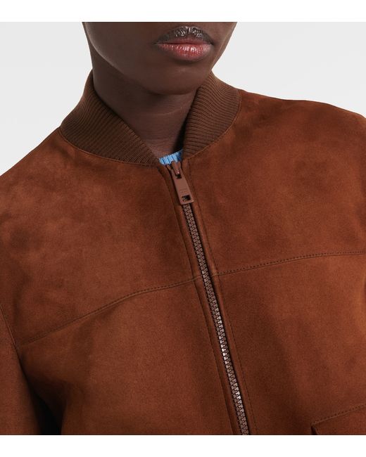 Material: 100% lamb leather (suede). Care instructions: specialist clean. Made in Italy. Designer color name: Cognac. Item color: brown. Trim: 90% wool, 9% polyamide, 1% elastane. Cuff: elasticated. Hem: elasticated. Closure: zipped front. Pockets: buttoned pocket. Leather.