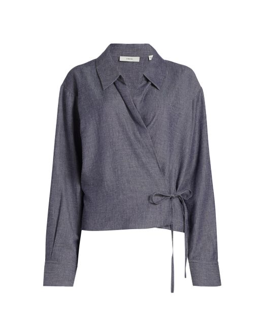 Styled with an open collar, this wrap top from Vince is cut for a relaxed fit. Open collar Long sleeves Wrap closure 67% viscose/24% linen/9% nylon Dry clean Imported SIZE & FIT About 23" from shoulder to hem Model measurements: 5'10" tall Model is wearing a US size Small. Contemporary Sportswear - Vince > Vince > Saks Fifth Avenue > Barneys. Vince. Color: Indigo. Size: Large.