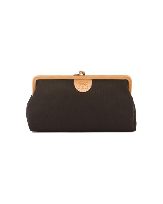 From the Manuela Collection. II Bisonte's Classic canvas clutch showcases an iconic retro-inspired kiss lock snap closure, vegetable-tanned leather trim, and interior open pocket. Made with responsibly tanned leather Kiss lock closure Interior open pocket Goldtone hardware Authenticity card included Dustbag included 100% cotton Trim: Leather Made in Italy SIZE Weight: about 0.5lbs About, 10.25"L x 5.5"H x 2.75"D. Handbags - Collection Handbags > Il Bisonte > Saks Fifth Avenue > Barneys. Il Bisonte. Color: Nero Gold.