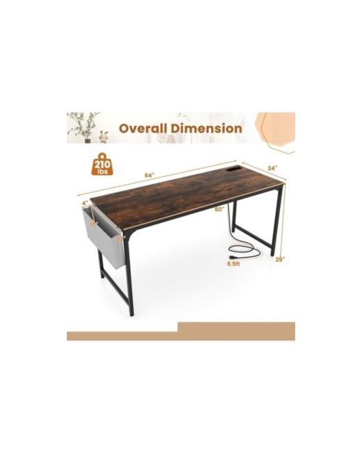 This 60" computer desk features a built-in charging station with 2 outlets and 2 Usb ports, a spacious desktop, and organized storage with a bag and headphone hook. Built with a robust metal frame and X-bar reinforcement, it provides stability and versatility for work, study, or gaming in any home setting.