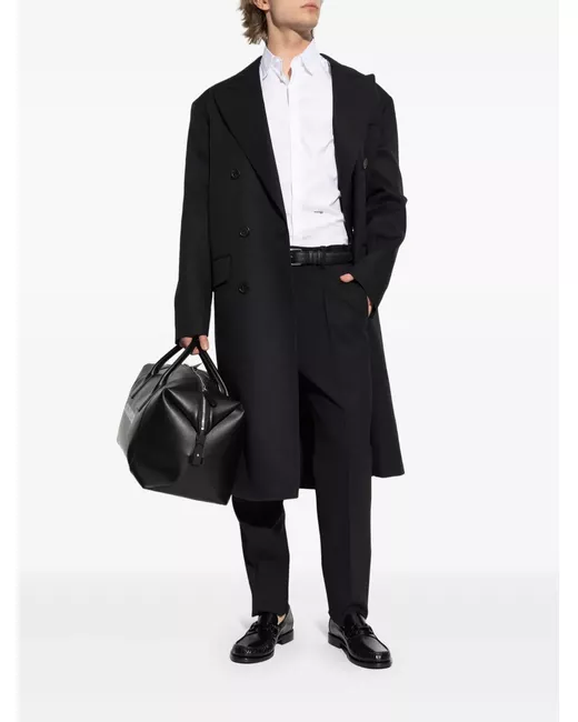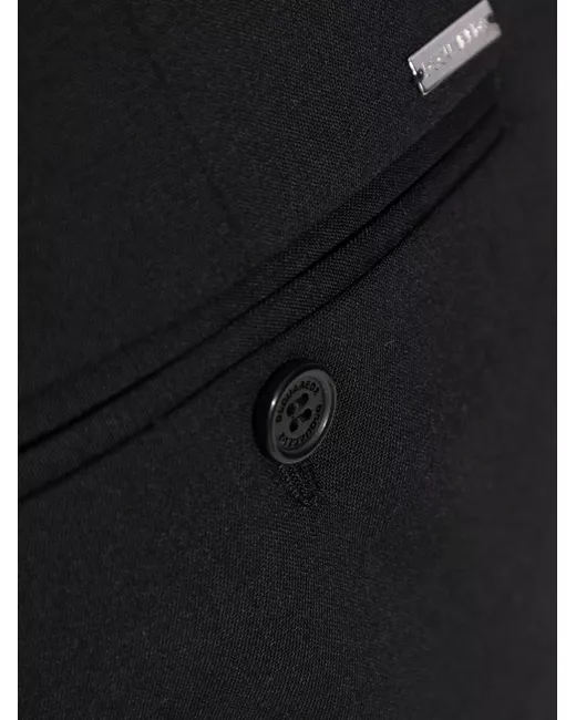 black concealed front fastening two side slit pockets two rear jetted pockets belt loops