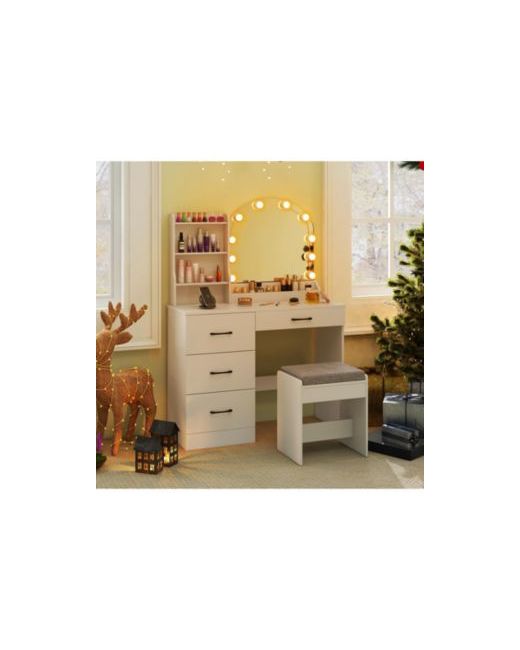 Enhance your beauty space with this modern vanity set featuring a sliding Led mirror with 3 adjustable lighting modes, a built-in charging station, and ample storage. Crafted from durable Mdf, it includes 4 drawers and 3 open shelves to keep essentials organized. Ideal for makeup, hair styling, and device charging in style.