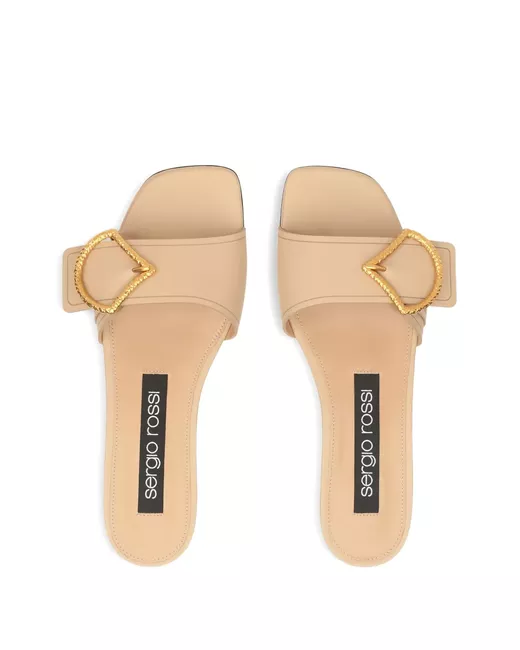 light beige slip-on style flat leather sole decorative buckle detail open toe