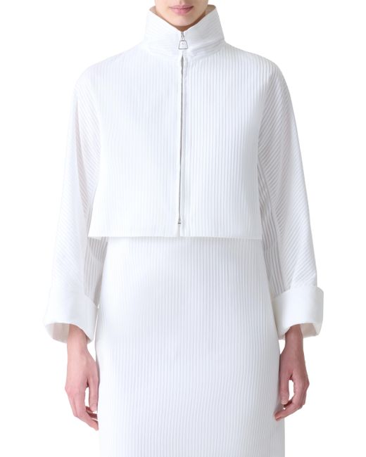 Crafted of light cotton voile, Akris' Mimi short jacket is elected with stitched pleats mimicking a chunky rib-knit look. This boxy A-line style features a stand collar, inverted back pleat, and kimono-inspired long sleeves. Stand collar Long sleeves, folded cuffs Back inverted pleat Front zip closure 100% cotton Trim: 100% cotton Dry clean Imported SIZE & FIT Model measurements: 5'10" tall Model is wearing a US size 4 ABOUT THE BRAND Founded in 1922 in St. Gallen, Switzerland, the name Akris was derived from founder Alice-Kriemler Schoch's initials. The entrepreneurial designer first started designing dotted aprons with intricate embroidery and soft cotton, which quickly grew into a full line of ready-to-wear. Almost 100 years later, the brand is now helmed by her grandsons. Creative Director Albert Kriemler continues to pay homage to his grandmother through polka-dot lined clothing, luxe fabrications and modern design-which now include sleek accessories like the cult-favorite AI trapezoidal handbag. Advanced European - Akris > Akris > Saks Fifth Avenue > Barneys. Akris. Color: White. Size: 4.
