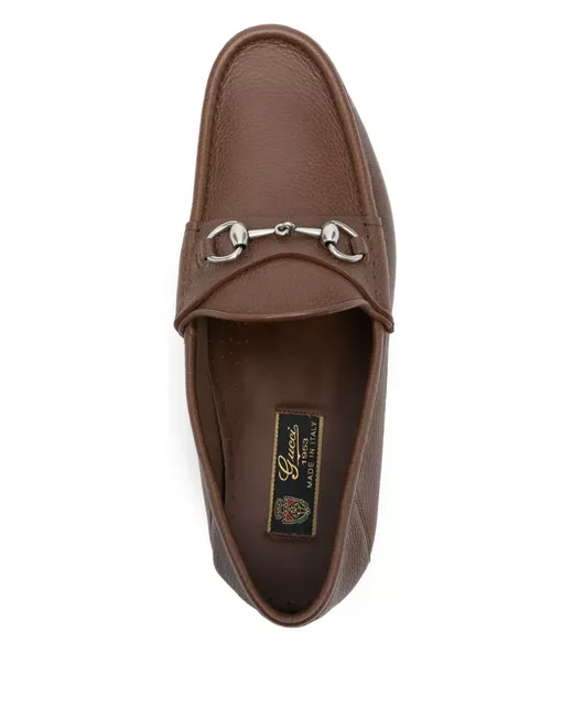 chestnut brown horsebit detail moc stitching almond toe branded leather insole