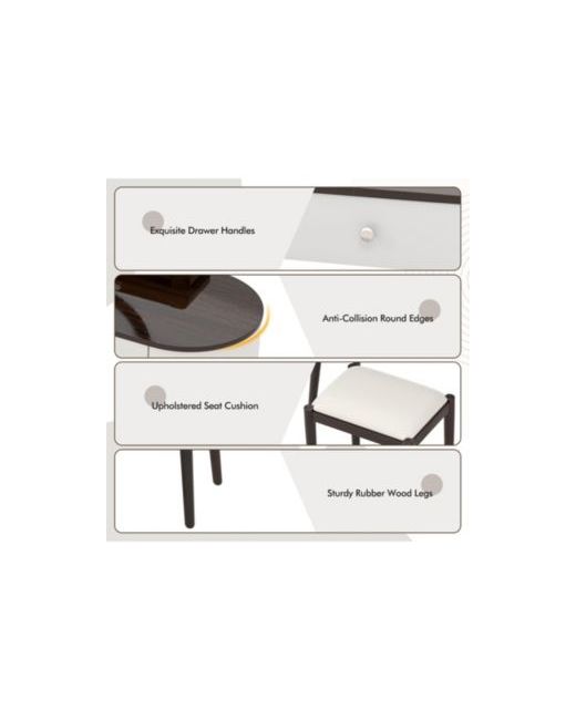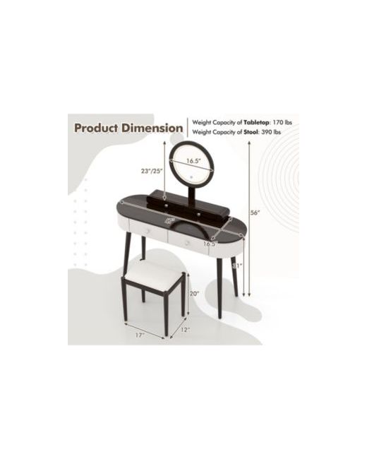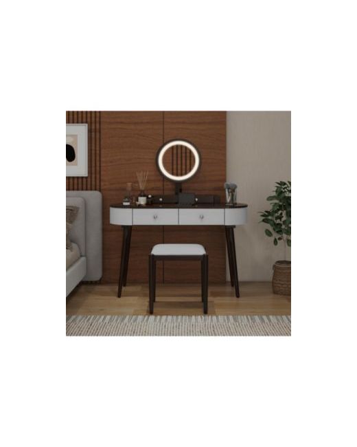 Enhance your beauty routine with this elegant vanity set featuring a 3-color Led mirror, spacious storage, and a cushioned Pu leather stool. The solid rubber wood frame ensures durability, while the removable mirror transforms the table into a writing desk. Ideal for organizing beauty essentials in style.