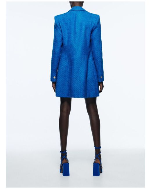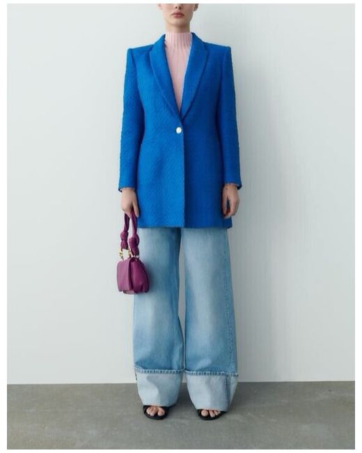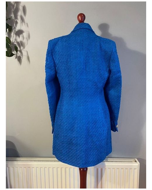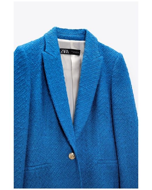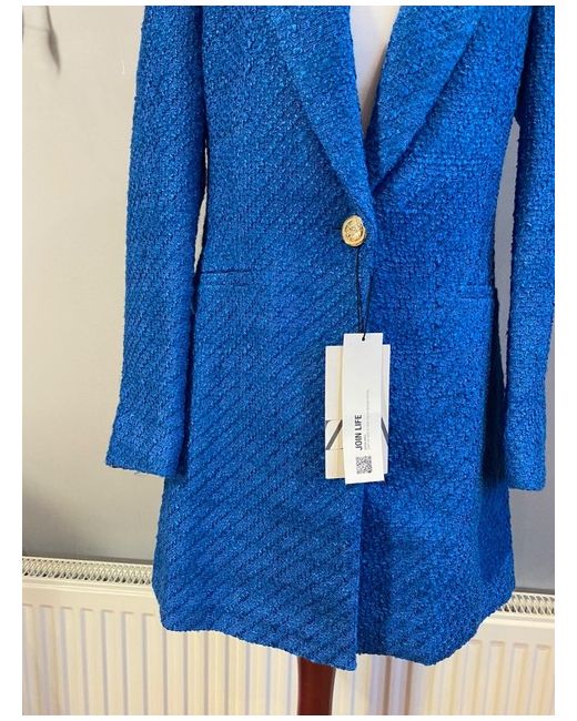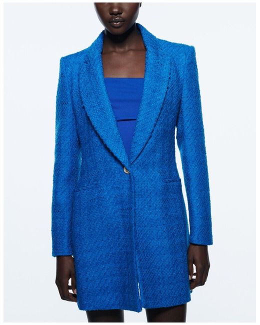 Lapel collar blazer with long sleeves and shoulder pads. Front welt pockets. Front closure with embossed gold button.