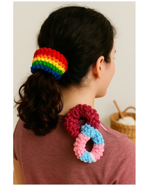 Whether you’re festival-ready, showing up for your community, or just fancy looking fabulous, this scrunchie’s got you covered. These scrunchies are crocheted by a trans woman in the UK using soft, stretchy yarn in Pride and trans flag colours.