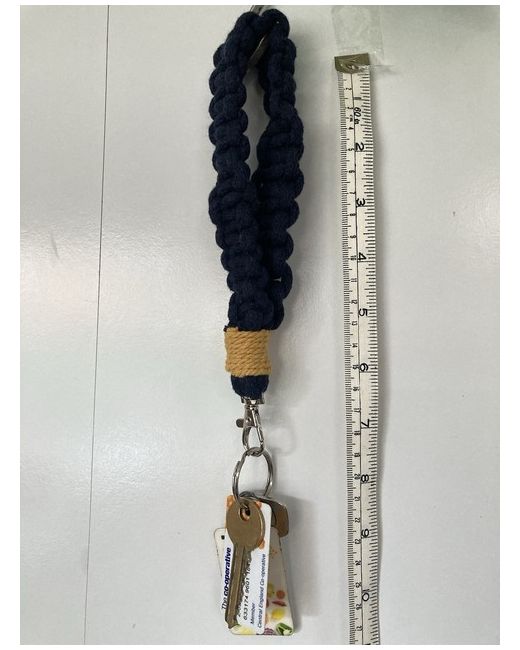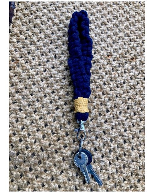 Elevate your accessories collection with this charming, handmade macramé wristlet, a versatile addition that doubles as a stylish wrist strap or key chain. Featuring an attractive navy blue and mustard colour scheme, it effortlessly complements an array of outfits and personalises your everyday items. Crafted with care, this piece is designed for people who appreciate a touch of uniqueness and practicality. The wristlet's strap accent ensures your essentials are secure and within reach, while the charmed character adds a playful twist to your daily routine. Keep your keys, phone, or bag adorned with this delightful macramé charm.overall length is 20cm. The length where your wrist goes through is 13.5 cm