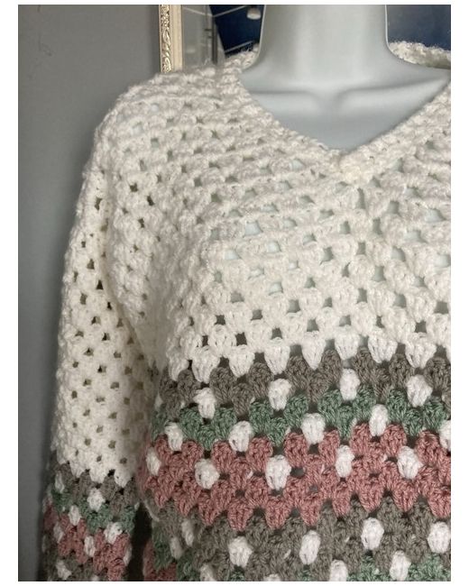 This handmade crochet jumper is a must-have for any fashion-conscious woman. The multicoloured granny square design is perfect for any outfit, while the V-neckline and pullover style provide both comfort and style. The jumper is available in size 14 and is suitable for regular size types. The jumper is perfect for any occasion, whether it's a casual day out or a night on the town. Top quality crochet.Don't miss out on the opportunity to add this stunning piece to your wardrobe.