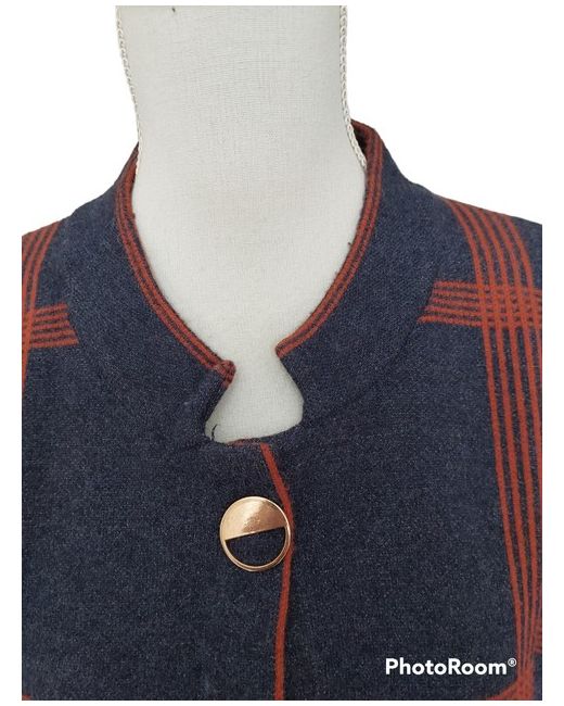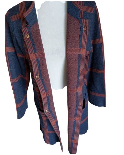 This Dark Blue/ Grey With Rust Stripes Coat/Jacket is Fabulous. I believe that the jacket is handmade so there is no label-- however, I don't think it has ever been worn. We add lots each week.
