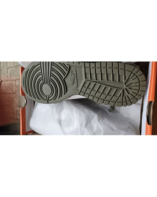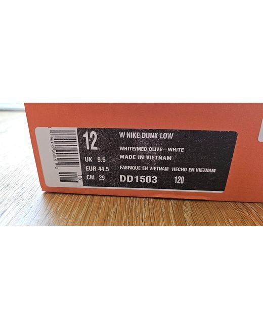 Nike Dunk Low ‘Medium Olive’ in UK size 9.5. These low-top trainers feature a green leather upper. Released in 2022, they are designed for women and have a US size of 12 and EU size of 44.5. The shoes are brand new and come in a replaced box.