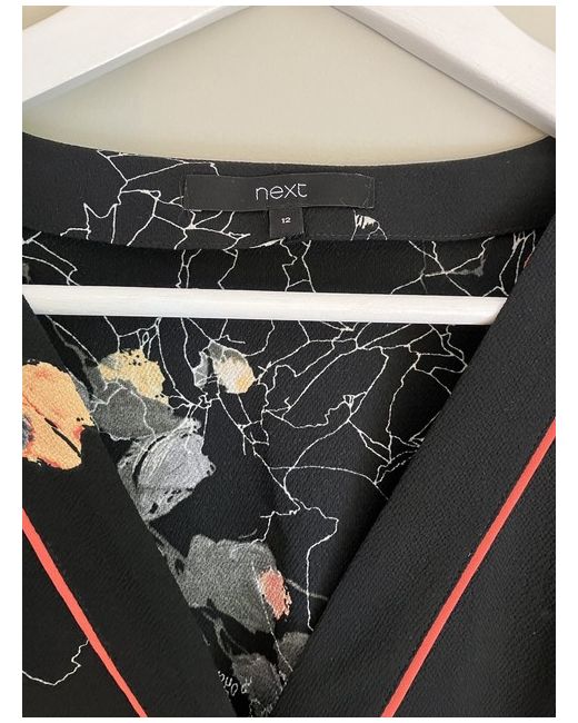 Size 12 wrap around blouse, Next, popper and button fastening with a waist tie and orange piping detail. Length from shoulder to hem is 61cm. New without tags. Polyester and elastane.