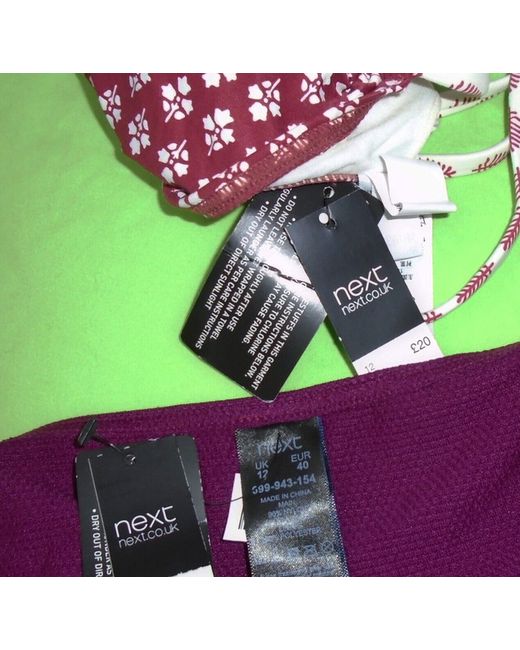 Top is a maroon red and white ditsy floral print, briefs are a darker plum / maroon. Briefs have small waffle texture and are a darker purple / maroon than the top. Briefs are high leg shape.