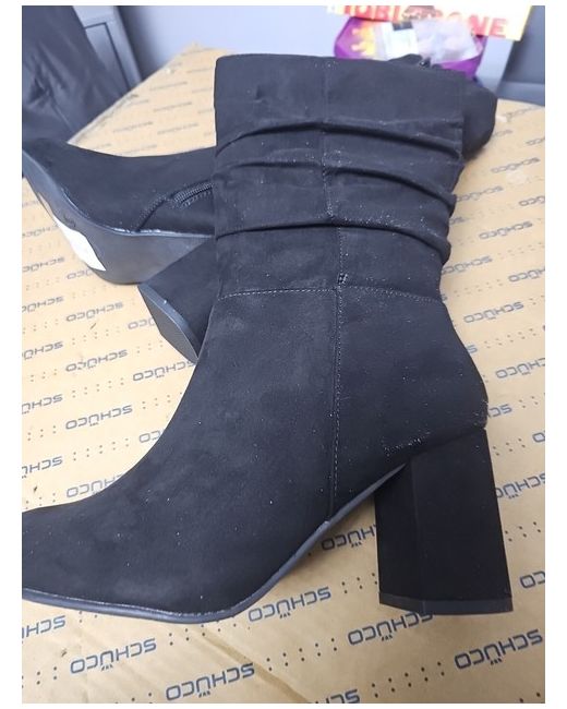 These are women's Next black suede boots in size 5 with a block heel. The style is a bootie with a mid heel height. The design features rouch detailing, making them a stylish choice for various outfits. They are brand new and are a versatile addition to any woman's shoe collection.