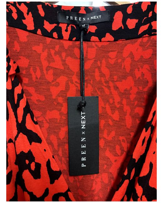 PREEN x NEXT. Patterned Red & Black V Neck Long Sleeve Long Jersey Dress. Gathered with elastic down the front skirt section. 5% elastane. 95% lenzing ecovero viscose. Flattering on.