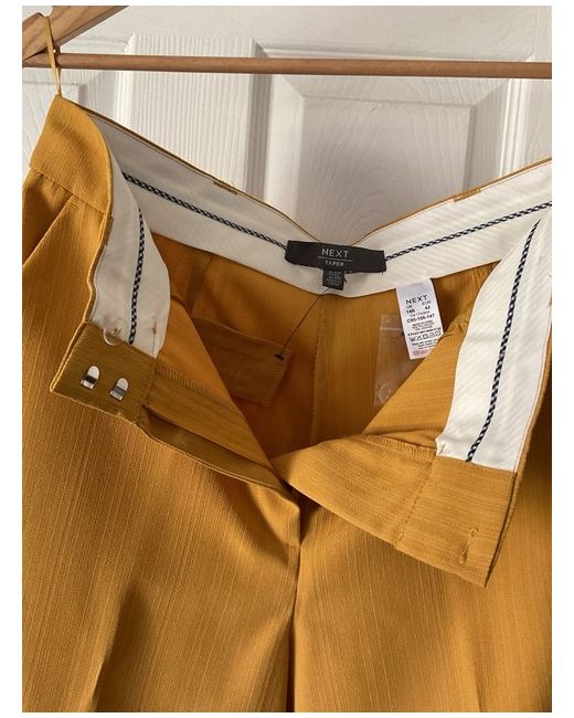 Elevate your work wardrobe with these stunning gold dress pants from NEXT. Designed with a straight leg style, these trousers are perfect for any formal occasion. Made from high-quality polyester material, they feature a slit for easy movement and pockets for added convenience. These women's trousers are available in size 14 and are suitable for regular size types. The trousers are perfect for any women's department and can be paired with any outfit for a stylish and sophisticated look.