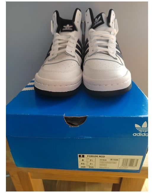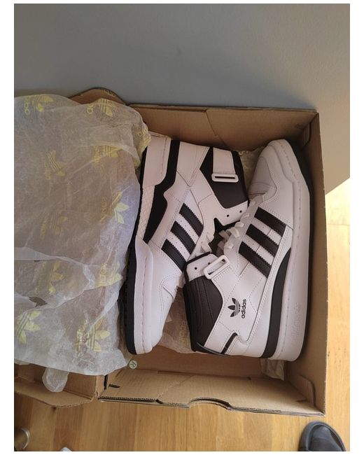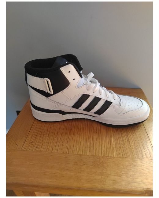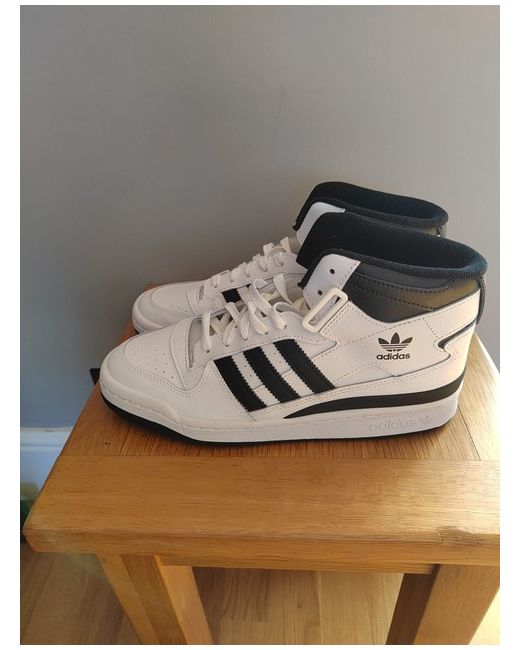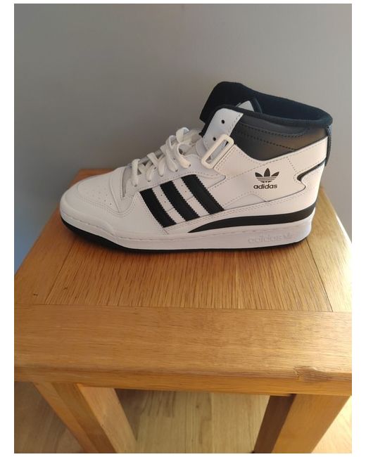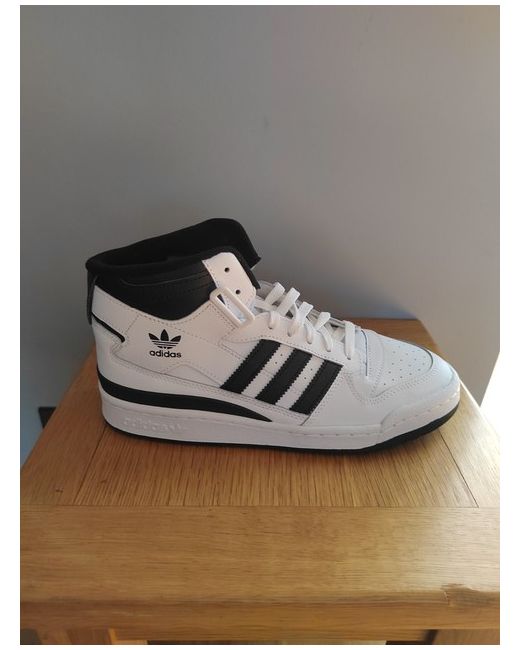 The shoes feature a standard shoe width and are crafted from leather with the iconic Adidas logo as an accent. Released in 2023, these trainers are part of the Adidas Forum product line, known for their stylish yet comfortable design.