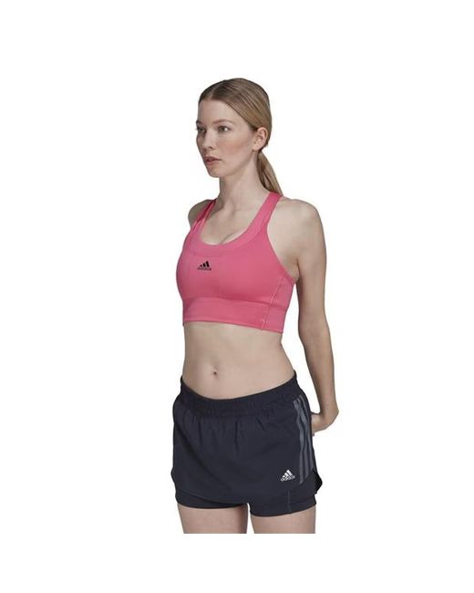 Head out at dusk or dawn with details that reflect light. Scoop neck with racer back. Available in multiple cup sizes. 89% polyester (recycled), 11% elastane. Built-in pockets and reflective bungee on back for storage.