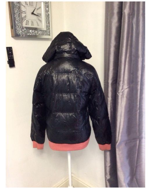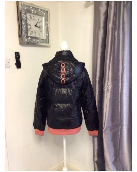 This is an adidas puffer jacket for girls in black, size 10. It is made of polyester and is designed as a regular fit coat. The style of the jacket is a puffer jacket, suitable for women's clothing. The cuffs are a lovely pinkish/red colour with sprinkles of gold glitter, the hood also is detachable , vintage classic