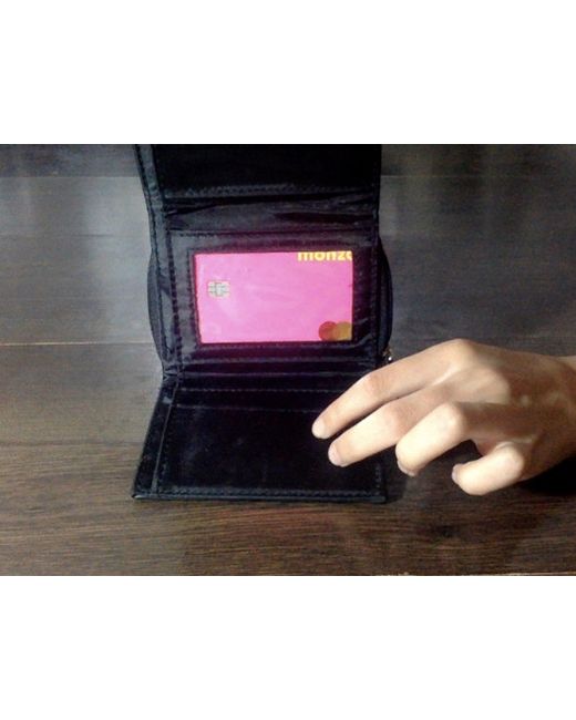 This wallet it black customised with a Gold L at the front. It is leather and from primark and has never been used before . Its good to hold pennies, card and other stuff like tickets for a very good price