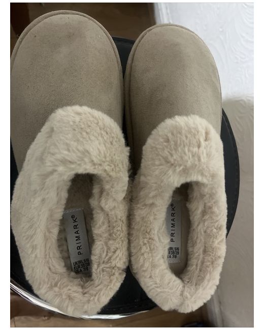 These are beige Primark Uggs in a size 5/6 for women. They are flat slip-on shoes made of faux suede material.(Uggs)