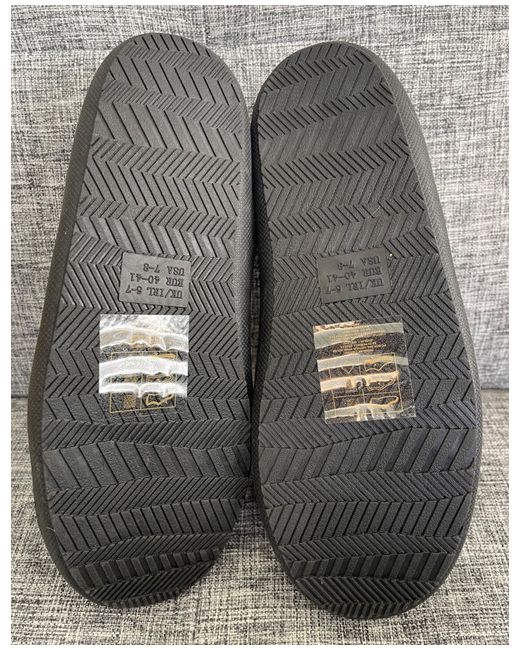 Very comfortable slippers and ideal for indoors and outdoors due to their rubber grip sole. Plush foam style insole and firm padded and stitched upper. One small slight mark from storage on the right toe bumper area but this can be wiped away .