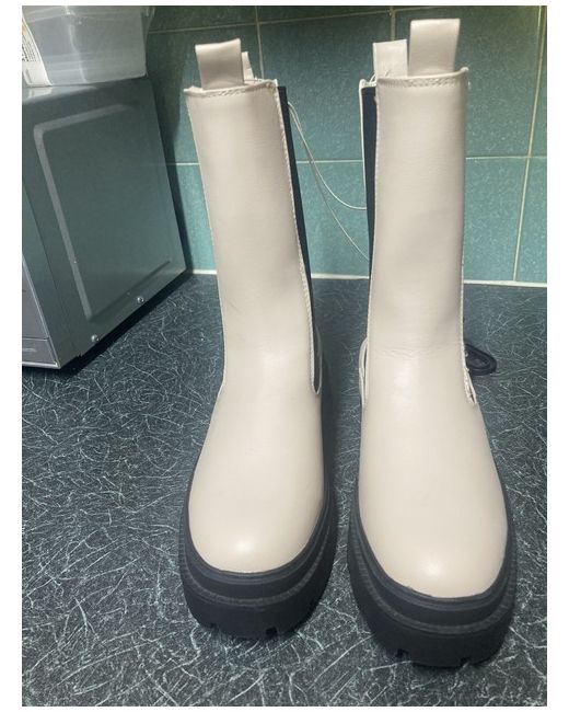 Primark Mid Calf Boots Size 6. Never worn still has tags but have been in wardrobe for a while. Cream pull on boots with black elasticated side panels. 11 inches high in total. 2 inch block heel with thick sole.