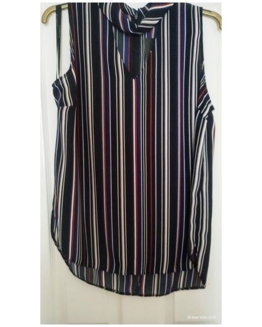 New Primark Striped Top , beautiful multicoloured striped pattern that is perfect for a holiday theme and comes in a size 16. The sleeveless style blouse is made of soft polyester satin fabric, accented with a charming bow and features a Keyhole Neck with a neck tie for easy wear. comes from a smoke free pet free home Thanks for looking.